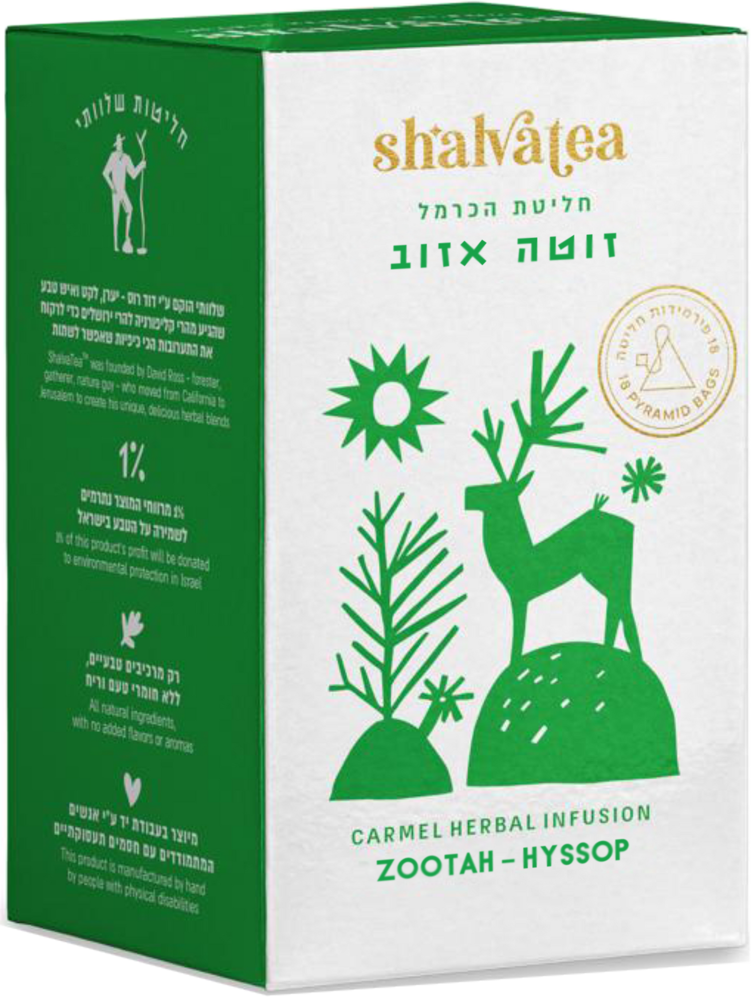A unique blend of hyssop (the main ingredient of za'tar), zootah (aka white macromeria, a kind of "mountain mint") and other local herbs makes for a spicy and warming blend, perfect for cold or rainy days. Earthy and nostaligic aroma, like the trails of the green, lush Carmel forest...